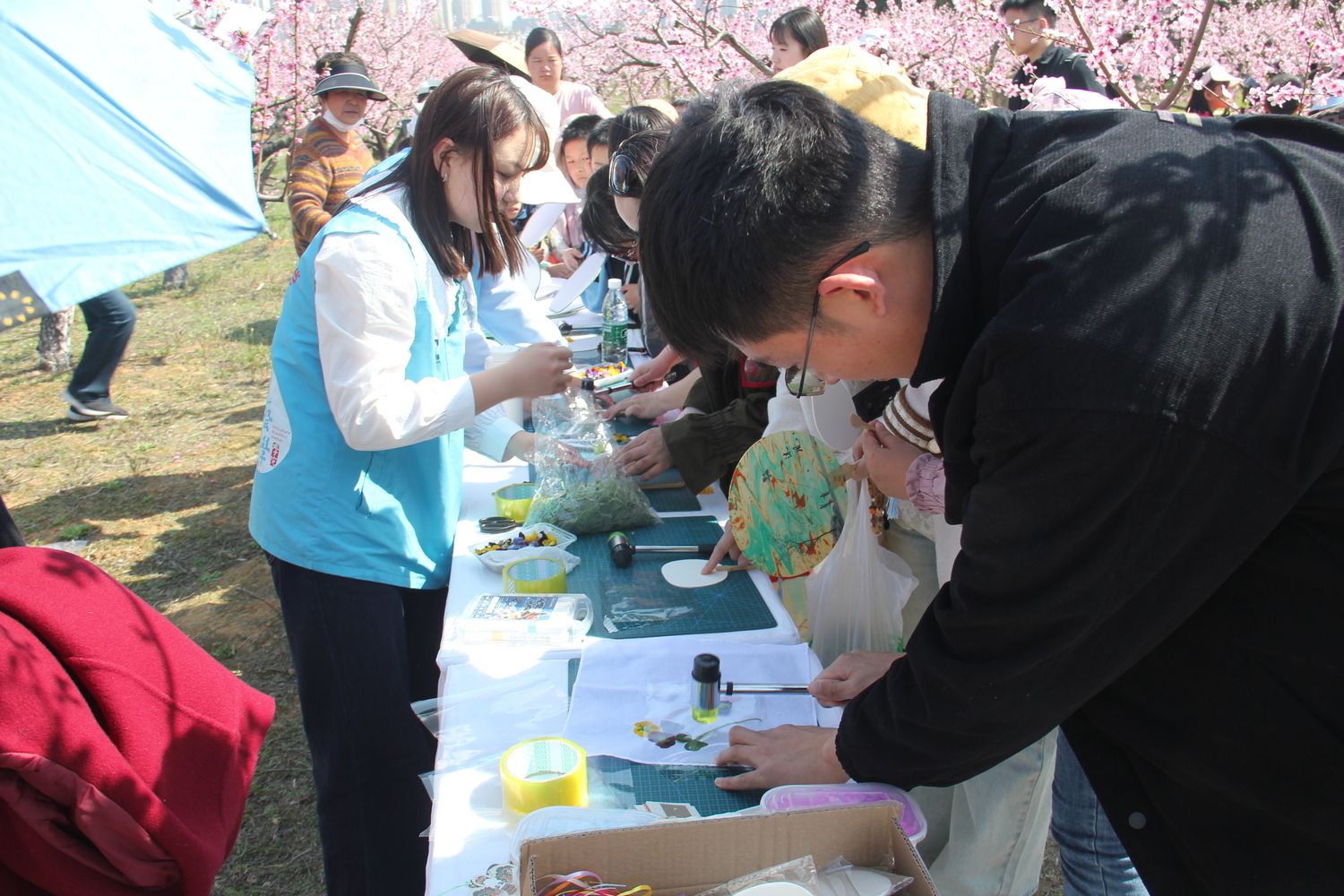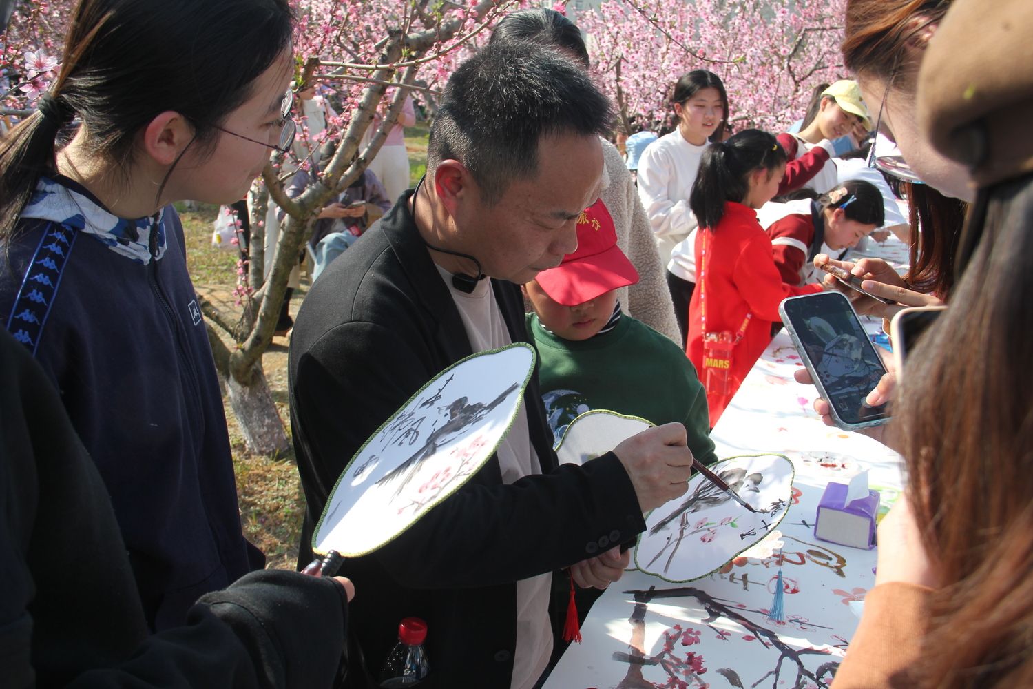 春意盎然的桃林中,“桃花艺术工坊”为游客们准备了一场别开生面的艺术创作体验。“桃韵绘卷”区域,长达10米的素白画卷横卧花海,参与者们执笔挥毫,在水彩与油彩的交融之间定格下桃枝摇曳的春日胜景。华中农业大学风景园林系秦仁强、洪勇辉老师现场进行创作引导,零基础爱好者亦有机会亲手勾勒心中的桃花源。而在“桃香印笺”体验区,拓印技艺正与艺术文创相互碰撞。参与者们一次次按下蘸染有各色颜料的花瓣模板,宣纸、书签、纸扇上不断绽放出桃花胜景。