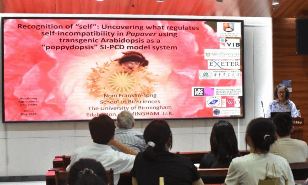 2025年5月22日,应柴利军教授和林宗成教授邀请,英国皇家学会会士、英国伯明翰大学Vernonica Franklin-Tong教授来我校访问,并于当天下午在园林南楼204报告厅作了题为“Recognition of “self”: Uncovering what regulates self-incompatibility in Papaver using transgenic Arabidopsis as a “poppydopsis” SI-PCD model system”的学术汇报。报告由学院设施与智慧园艺系林宗成教授主持,学院果树系柴利军教授,园林系梁梅教授等60余名师生参加。