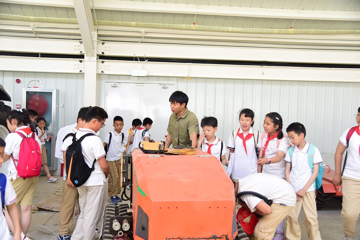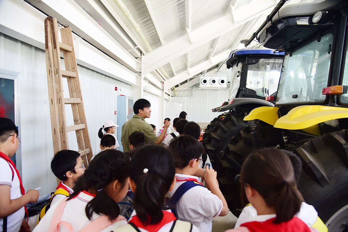 活动伊始,一场轻松有趣的互动游戏迅速点燃了现场气氛。基地宋竹平老师指着一台拖拉机问道:“大家猜猜这是什么?” “拖拉机!”孩子们齐声回答。随即,他又问:“那它用来做什么呢?”孩子们一句稚气的“拖地的!”引得现场老师们和志愿者们忍俊不禁。在欢乐的氛围中,孩子们了解了拖拉机的真正用途。而当目光转向一旁的机器时,不等提问,已有孩子兴奋地认出:“是喷农药的无人机!” 孩子们对现代农业科技的好奇与初步认知,在这个特殊的日子里显得格外有意义。