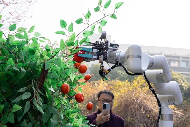 柑橘采摘机器人牢牢锁定了“枝头”一枚成熟的“果实”,随即将机械臂灵活伸出,仿生夹爪抓取住果实,如同经验丰富的果农抓取剪切,一颗完整的柑橘便被无损采收。