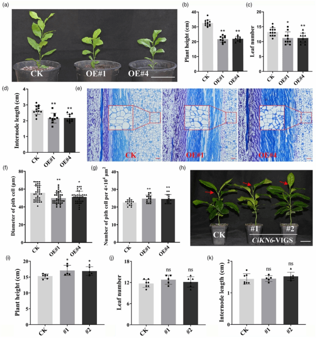 研究发现 Ci-miR156c-CiSPL3 模块可能通过靶向 前期报道柑橘叶型发育关键调控基因CiKN6 参与株高发育调控(Zeng er al., 2022)。对 CiKN6 的功能分析显示,与对照相比,CiKN6 超量表达株系的株高、叶片数和平均节间长均显著降低(图3a-d)。茎组织石蜡纵切片分析表明,CiKN6 超量表达植株的细胞直径显著小于对照,且单位横截面积内的细胞数量增加(图3e-g)。利用病毒诱导基因沉默(VIGS)技术抑制柑橘中 CiKN6 的表达后,CiKN6-VIGS 植株的株高显著高于对照,而叶片数和平均节间长与对照无显著差异(图3h-k)。这些结果共同表明 CiKN6 参与调控柑橘株高。