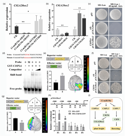 图5. Ci-miR156c-CiSPL路径通过结合CiGA20ox2启动子抑制GA的生物合成