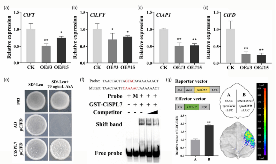 前期研究已确定,Ci-miR156 在柑橘中靶向 9 个具有完整 SBP 结构域的 CiSPL 基因(Wu et al., 2010, 2015)。本研究通过 RT-qPCR 检测发现,在 Ci-miR156c 超量表达植株中,关键成花基因 CiFT、CiLFY、CiAP1 和 CiFD 的表达水平均较对照显著下调(图2a-d)。鉴于已有研究表明过表达 CiFT 和 CiFD 能促进柑橘开花(Wu et al., 2022; Ye et al., 2023),结合酵母单杂交(Y1H)、电泳迁移率变动分析(EMSA)及双荧光素酶报告基因(LUC)实验结果,本研究证实 Ci-miR156c-CiSPL7 模块通过靶向 CiFD 参与调控柑橘开花。