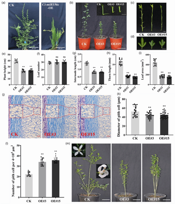 图1. Ci-miR156c-OE(过表达)转基因柑橘表型分析