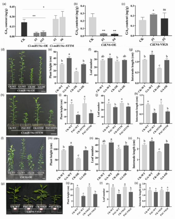 为分析 GA3 在株高调节中的作用,本研究分别用外源 GA3 和赤霉素抑制剂多效唑(paclobutrazol, PAC)处理转基因植株。GA3 处理使 Ci-miR156c-OE 株系的株高、叶片数和节间长度恢复至野生型(WT)水平(图4d-g)。与未经处理的 STTM 植株相比,PAC 处理显著降低了 Ci-miR156c-STTM 植株的株高(图4h-i),并减少了其叶片数量和平均节间长度(图4j-k)。同样地,GA3 处理也使 CiKN6-OE 株系的株高、叶片数和节间长度恢复至 WT 水平(图4l-o)。与之相反,PAC 处理显著降低了 CiKN6-VIGS 植株的株高(图4p-q),并减少了其叶片数量和平均节间长度(图4r-s)。综上所述,GA3 处理能完全恢复 Ci-miR156c-OE 和 CiKN6-OE 植株的矮化表型,表明这些转基因植株的矮化表型源于内源 GA3 水平的降低。