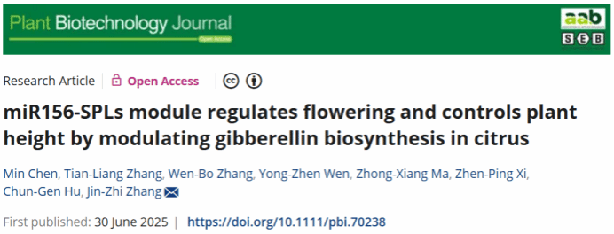 近日,Plant Biotechnology Journal在线发表了我室胡春根教授和张金智教授课题组的重要研究成果。该研究首次深入解析了 miR156-SPLs 基因模块如何通过调控赤霉素(GA)生物合成,协同控制柑橘开花与株高发育的双重机制。这一发现为攻克柑橘漫长童期和树体高大这两大制约产业发展的关键瓶颈,提供了全新的分子靶标和理论依据,对加速柑橘矮化密植新品种培育、提升柑橘生产效益具有重大意义。