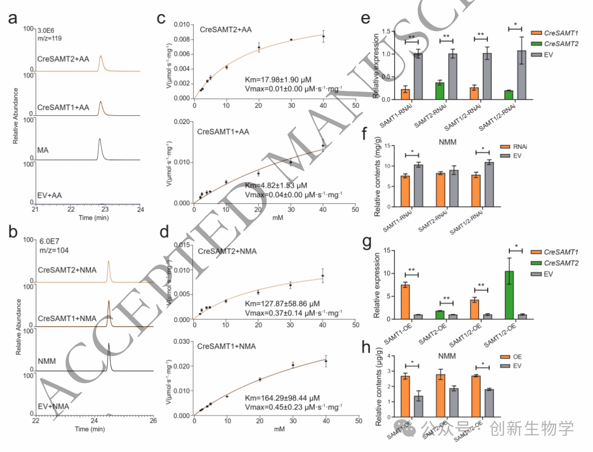 筛选了含有PF03492基序的基因模型,该基序对应于典型植物SAMTs的Methyltransf_7结构域。在C. reticulata ‘Mangshan’基因组中,共鉴定出49个潜在的CreSAMT基因。通过相关性分析和WGCNA分析,确定了CreSAMT1和Cre2g 027310.1基因与NMM的积累密切相关。由于NMM的生物合成之前未被表征,因此分析了候选基因的生化性质和底物特异性。研究团队通过体外酶学实验证实,CreSAMT1和CreSAMT2都能够催化NMA和AA的甲基化,分别生成NMM和MA。CreSAMT1对AA的亲和力和催化效率最高,而CreSAMT2对BA、SA和NMA的亲和力和催化效率更高。瞬时RNAi和OE实验进一步证实,CreSAMT1在NMM的生物合成中起关键作用。