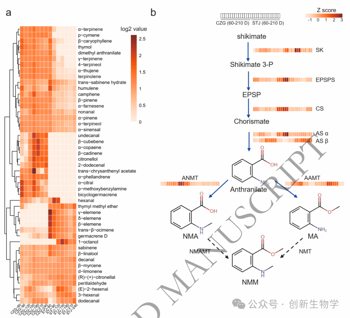 为了进一步研究参与NMM生物合成的基因,研究团队分析了茶枝柑(CZG)和沙糖橘(STJ)在不同发育阶段的挥发性成分。共检测到47种挥发性化合物,其中CZG中有43种,STJ中有36种。包括NMM在内的7种挥发性化合物已被证实是陈化广陈皮中的重要香气活性物质,这些化合物在新鲜的CZG果皮中均被检测到。结果显示,随着果实发育,STJ中NMM的含量逐渐下降,并在成熟期消失,而CZG中NMM的含量在整个发育过程中始终保持较高水平。