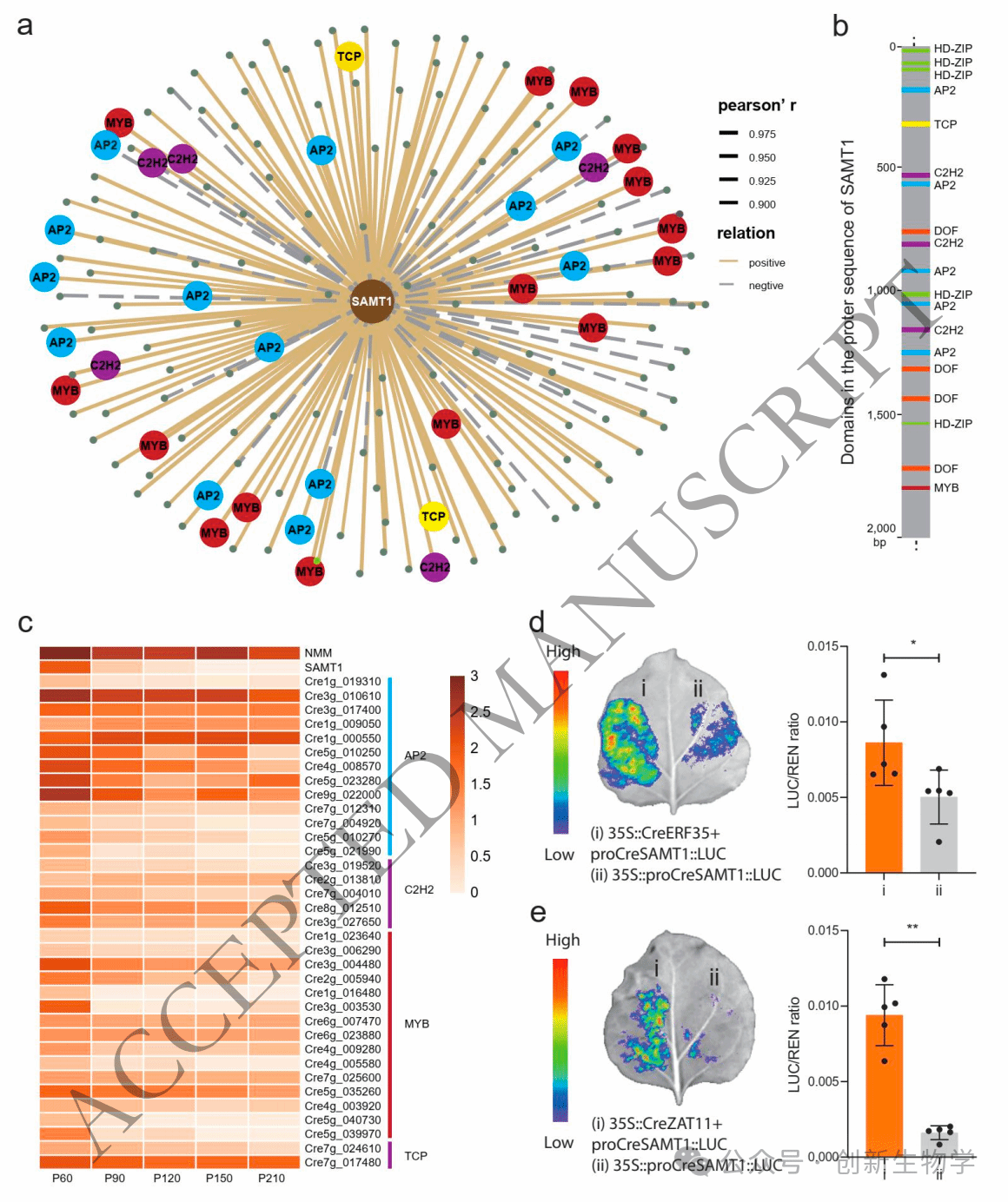 为了进一步阐明CZG中NMM积累的调控机制,研究团队进行了共表达网络分析。通过共表达网络分析,研究人员发现143个转录因子与CreSAMT1的表达显著相关。在这些与CreSAMT1显著相关的转录因子中,有13个AP2、5个C2H2、15个MYB和2个TCP,这些是研究团队关注的重点。同时,双荧光素酶报告基因测定表明,CreERF35和CreZAT11被证实能够促进CreSAMT1的表达。