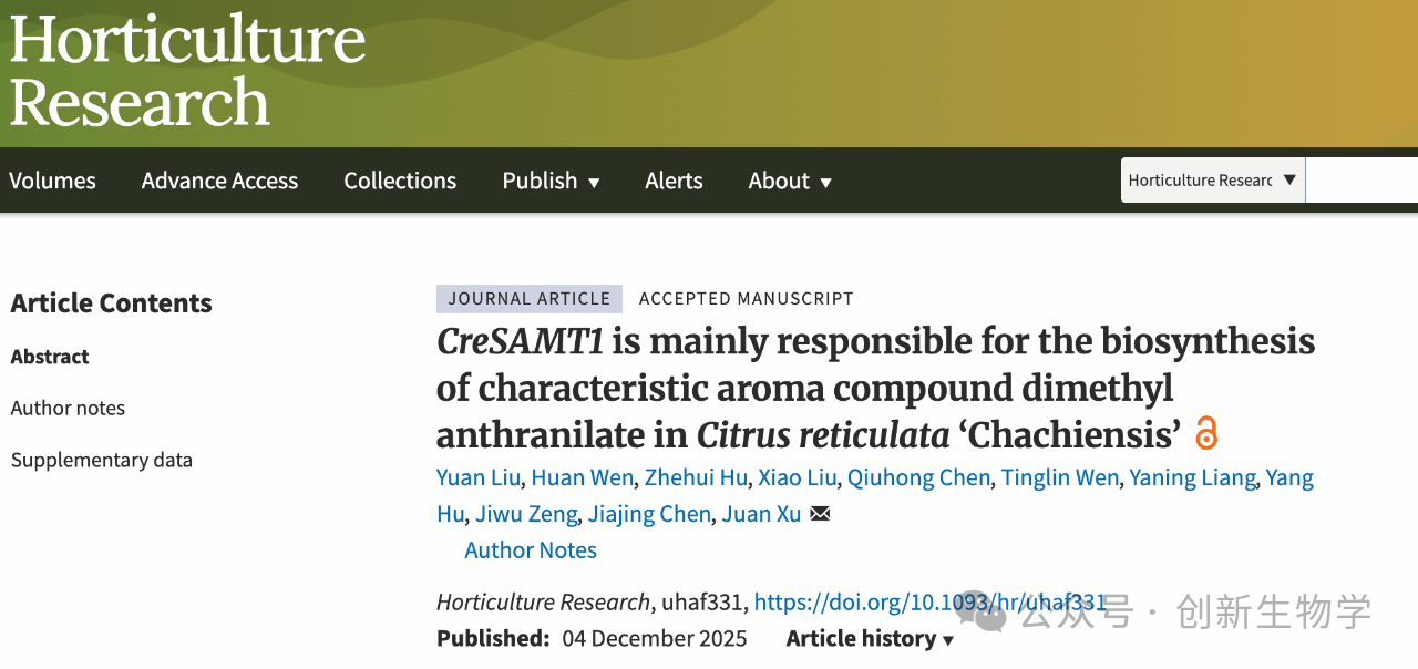 12月4日,果蔬园艺作物种质创新与利用全国重点实验室徐娟教授团队在《HorticultureResearch》期刊上在线发表(最终校稿还未提交)了题为“CreSAMT1 is mainly responsible for the biosynthesis of characteristic aroma compound dimethyl anthranilate in Citrus reticulata ‘Chachiensis’”的研究论文,首次阐明了NMM在柑橘中的生物合成途径,确定了CreSAMT1和CreSAMT2基因的功能,并揭示了转录因子在NMM生物合成调控中的作用。这些发现为柑橘风味育种和GCP品质提升提供了重要的理论基础,并为推动柑橘香料产业的发展提供了新的思路。
