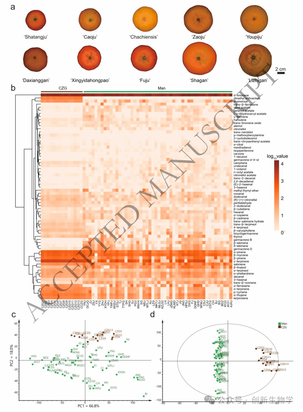 GC-MS分析共检测到67种挥发性化合物,包括49种萜类化合物、15种脂肪酸衍生物和3种苯丙烷/苯化合物。在所有64个柑橘品种中,d-柠檬烯是最丰富的挥发性化合物。NMM被认为是CZG及其对应产品GCP的重要生物标志物。所有CZG样品中的NMM平均含量为118.34±19.75 μg·g-1,而在其他柑橘品种中均未检测到。此外,根据已发表的数据,108份柑橘种质,包括橙子、柚子、柠檬和宜昌橙,在其成熟果皮中均未积累NMM,这进一步证明了CZG的独特性。PCA和OPLS-DA分析也证实了CZG与其他柑橘品种在挥发性成分上的显著差异。