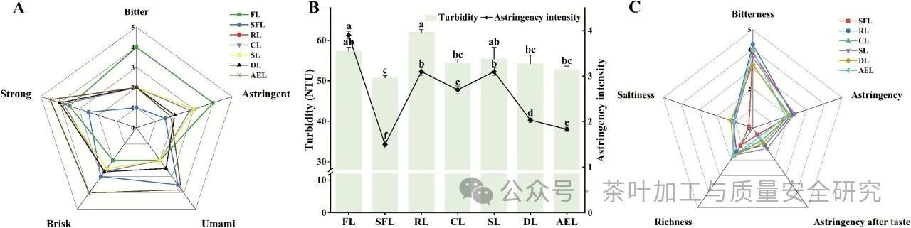 研究结果表明:作为绿茶的核心品质属性,恩施玉露绿茶的滋味在加工过程中发生显著变化:高温杀青后,青草涩味消散,呈现明显醇厚感;但后续揉捻使杀青叶的苦涩味显著增强;理条过程在控温条件下部分缓解了苦涩味,但整形后苦涩味再次急剧回升;干燥和提香阶段,苦涩味大幅减弱,鲜味和醇厚感显著提升,最终形成圆润饱满的醇厚风味。恩施玉露绿茶加工过程中:揉捻叶浊度最高,整形叶次之,且揉捻叶浊度显著高于其他样品(p<0.05),表明揉捻和整形样品的涩味强于其他加工阶段样品(鲜叶除外)。电子舌分析结果显示,整形叶的涩味和涩后味评分最高,揉捻叶次之;同时,揉捻叶的苦味强度在所有样品中最高。