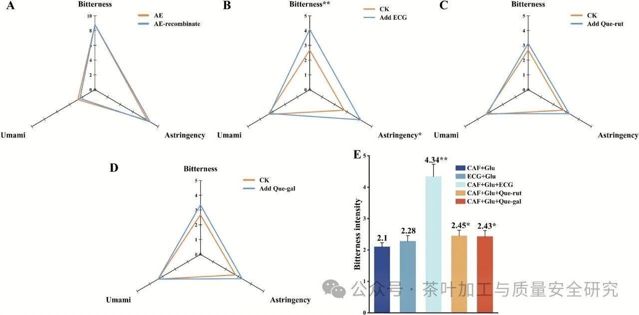 通过味觉重组实验评估候选物质能否重构提香茶汤(AE)的苦、涩、鲜滋味特征,对重构模型(r-AE)的滋味特征进行评价打分,并分析 r-AE与AE的相似度,结果表明:r-AE的苦味强度与AE相当,涩味强度略高,鲜味强度稍低;统计分析证实,r-AE与AE的苦、涩、鲜强度评分无显著差异(p>0.05),表明所选呈味活性化合物可有效重构 AE 的味觉模型。缺失实验表明,EGCG、ECG、咖啡因、Que-rut、Que-gal和谷氨酸是恩施玉露绿茶的关键呈味物质。