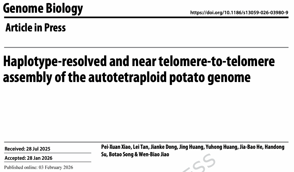 近日,我室园艺作物大数据与智能设计育种课题组焦文标教授在Genome Biology期刊上发表了题为“Haplotype-resolved and near telomere-to-telomere assembly of the autotetraploid potato genome”的研究论文。该研究开发了首个针对同源多倍体的完整单倍型组装方法,成功构建了同源四倍体马铃薯栽培种“华薯4号”的近完整单倍型基因组图谱。该项研究全面揭示了同源多倍体马铃薯基因组的复杂结构特征,也为马铃薯功能基因挖掘、基因组辅助育种等提供了研究基础。