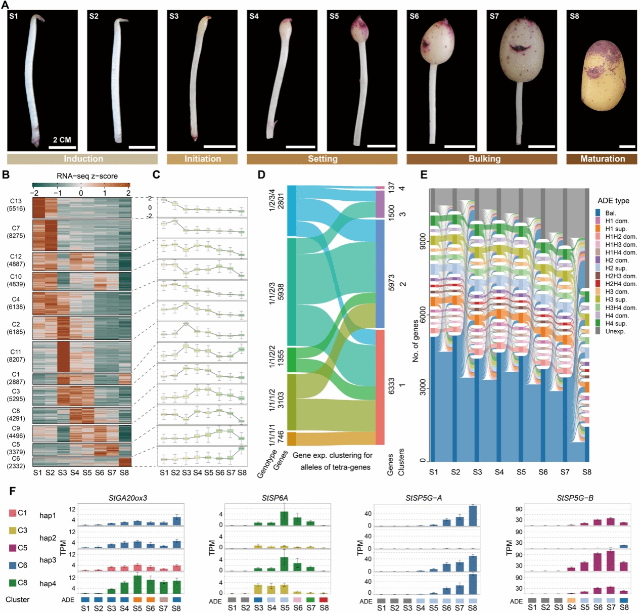 基于该高质量基因组,研究人员从基因组、转录组和表观组等多个维度深入分析了单倍型之间的差异。结果发现,“华薯4号”基因组中约34.82%的区域在单倍型之间高度相似,反映了育种过程中反复使用优良亲本留下的遗传印记。虽然四套单倍型整体上保持较高共线性,但仍存在大量结构变异和染色体重排现象。进一步结合DNA甲基化数据,单倍型高度相似区域整体的甲基化水平更低,但也有部分高度相似(>98%)的等位区段中,存在显著的甲基化差异,提示表观遗传调控可能在多倍体基因组中具有重要作用。为进一步探究单倍型变异的生物学作用,研究团队进一步分析了块茎发育全过程中等位基因的表达模式(图2)。研究发现,42.6%的基因存在等位差异表达。其中,55%的四等位基因的四个等位拷贝在不同发育阶段呈现出不同的等位差异表达模式(例如,某个单倍型上的等位拷贝可能在块茎形成期高表达、块茎成熟期低表达;而另外单倍型的等位拷贝呈现相反的表达模式),包括StSP5G-A、StSP5G-B和StSP6A等多个与块茎发育相关的基因。因此,单倍型之间的等位差异是马铃薯块茎发育的转录调控的重要遗传基础。