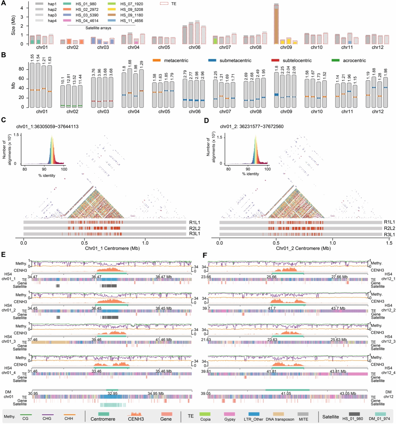 此外,完整单倍型组装有助于深入理解基因组“暗物质”区域着丝粒的结构特征。先前的研究表明马铃薯存在两种类型的着丝粒,即含有和不含有高度串联重复卫星序列的着丝粒,且栽培种单倍型之间着丝粒结构可能存在较大差异。然而,这些研究局限于细胞遗传学等手段或二倍体马铃薯基因组中。该研究首次对四倍体马铃薯着丝粒区域进行了单倍型序列水平上的高分辨率解析(图3)。研究发现不同单倍型在着丝粒大小与位置、卫星重复阵列类型、转座元件组成及甲基化水平等方面均存在显著差异,揭示了马铃薯复杂基因组区域在单倍型层面的高度可变性,为理解同源多倍体着丝粒区域的单倍型演化提供了重要见解。